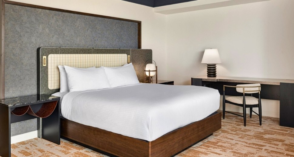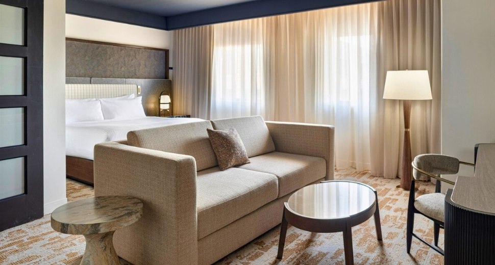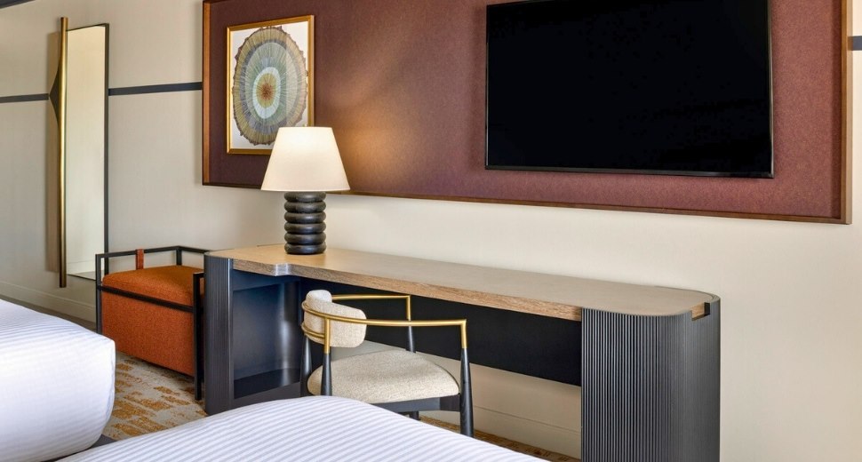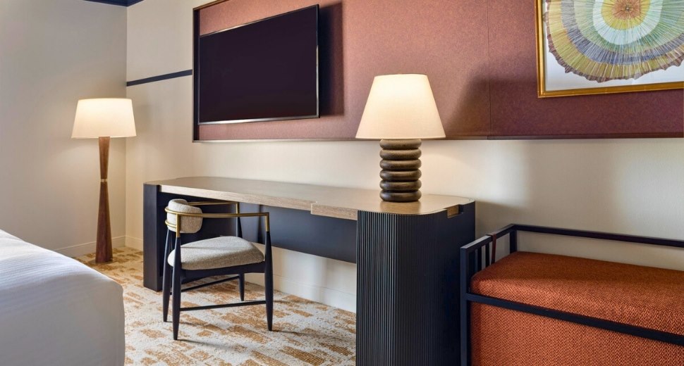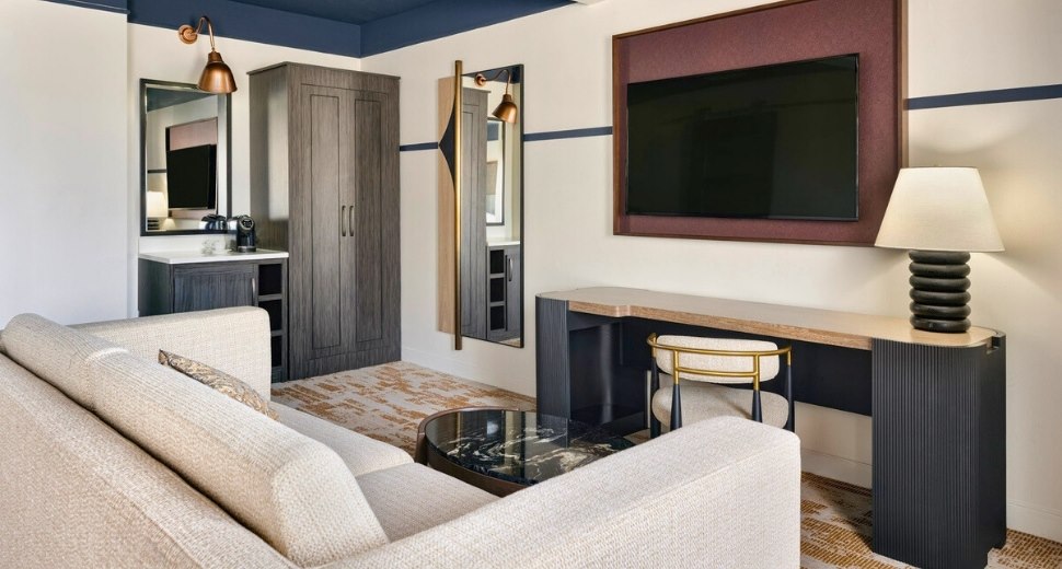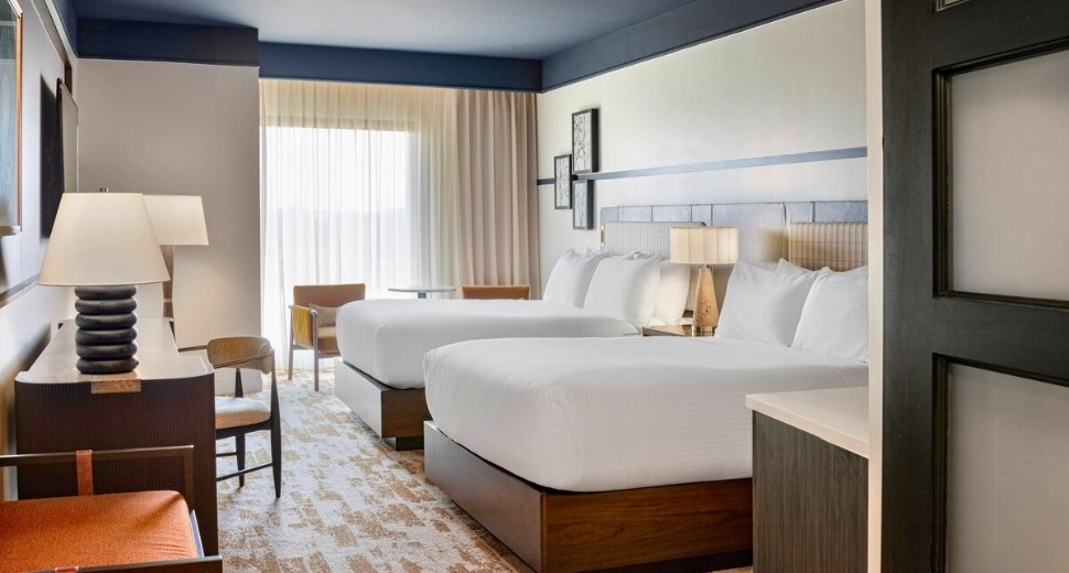 Choose from king or two-queen layouts, refresh in spa-inspired bathrooms with walk-in showers, and unwind with curated touches—like spacious seating areas, 55" streaming-enabled TVs, and soft, sophisticated finishes throughout.